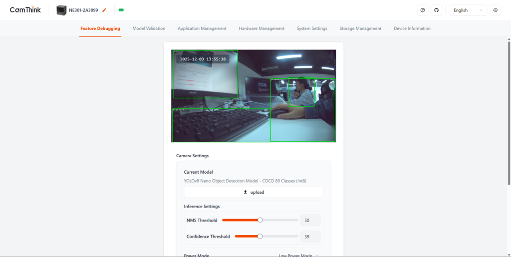 Powered by the on-board STM32N6 MCU with a 0.6 TOPS NPU, the NE301 supports real-time on-device inference on live video streams: